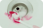 Staring in horror at a toothbrush covered in blood.
